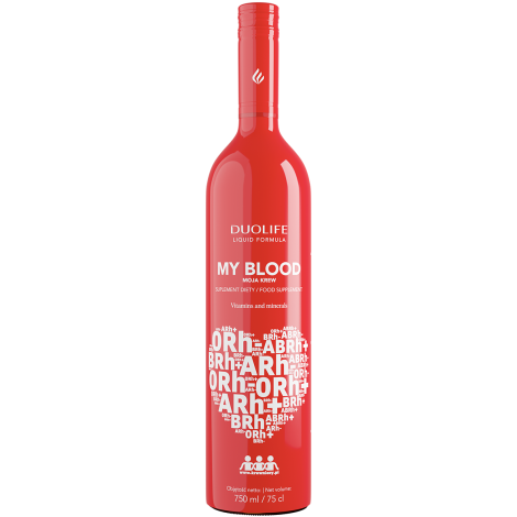 DUOLIFE My Blood jest suplementem diety w formie płynnej, opartym na kompleksie witamin i składników mineralnych. Składniki aktywne zawarte w produkcie m.in. pomagają w utrzymaniu prawidłowego stanu czerwonych krwinek, a także prawidłowej produkcji czerwonych krwinek i hemoglobiny oraz przyczyniają się do utrzymania prawidłowego metabolizmu żelaza.